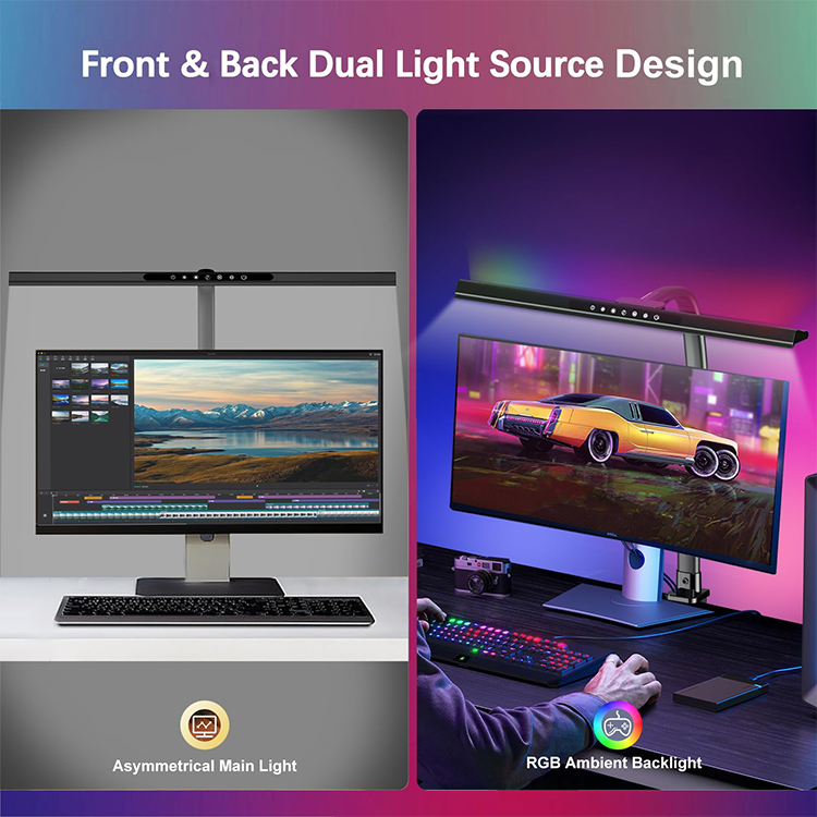 Đèn bàn 2 trong 1 có thể tạo thêm điểm nhấn thú vị với tính năng ánh sáng xung quanh RGB. Tạo bầu không khí tuyệt vời cho mọi công việc hoặc tâm trạng bằng màu sắc và mức độ sáng có thể tùy chỉnh . Thiết kế có thể điều chỉnh của nó đảm bảo góc chiếu sáng và giảm mỏi mắt khi làm việc trong thời gian dài.